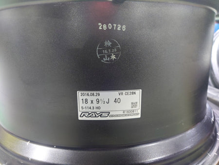 Manufacturer: RAYS CE28N in hyper gold; Size: 18×9.5J +40, 5×114.3 bolt pattern; new purchase used ~10,000 km; stored; mostly clean with one 4 cm curb nick and minor stone chips.
