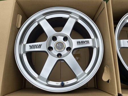 Aftermarket RAYS VOLK Racing TE37 forged wheels: front 18×8.5J +40 5x114.3, rear 18×9.5J +40 5x114.3. Compatible with multiple JDM models including Skyline, Silvia, Supra, and RX-7.