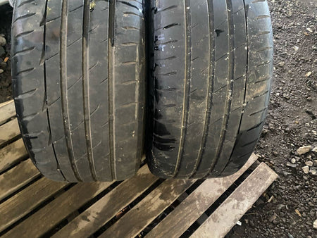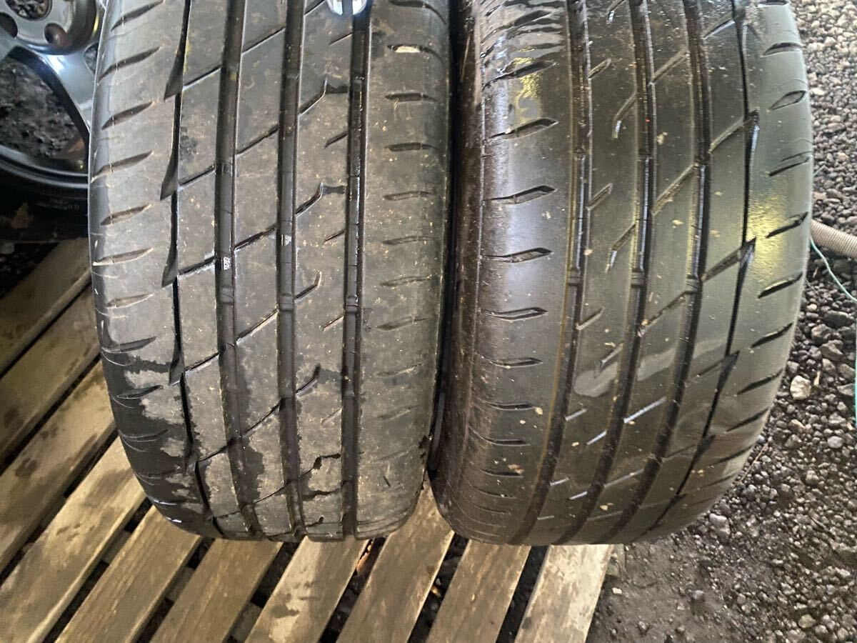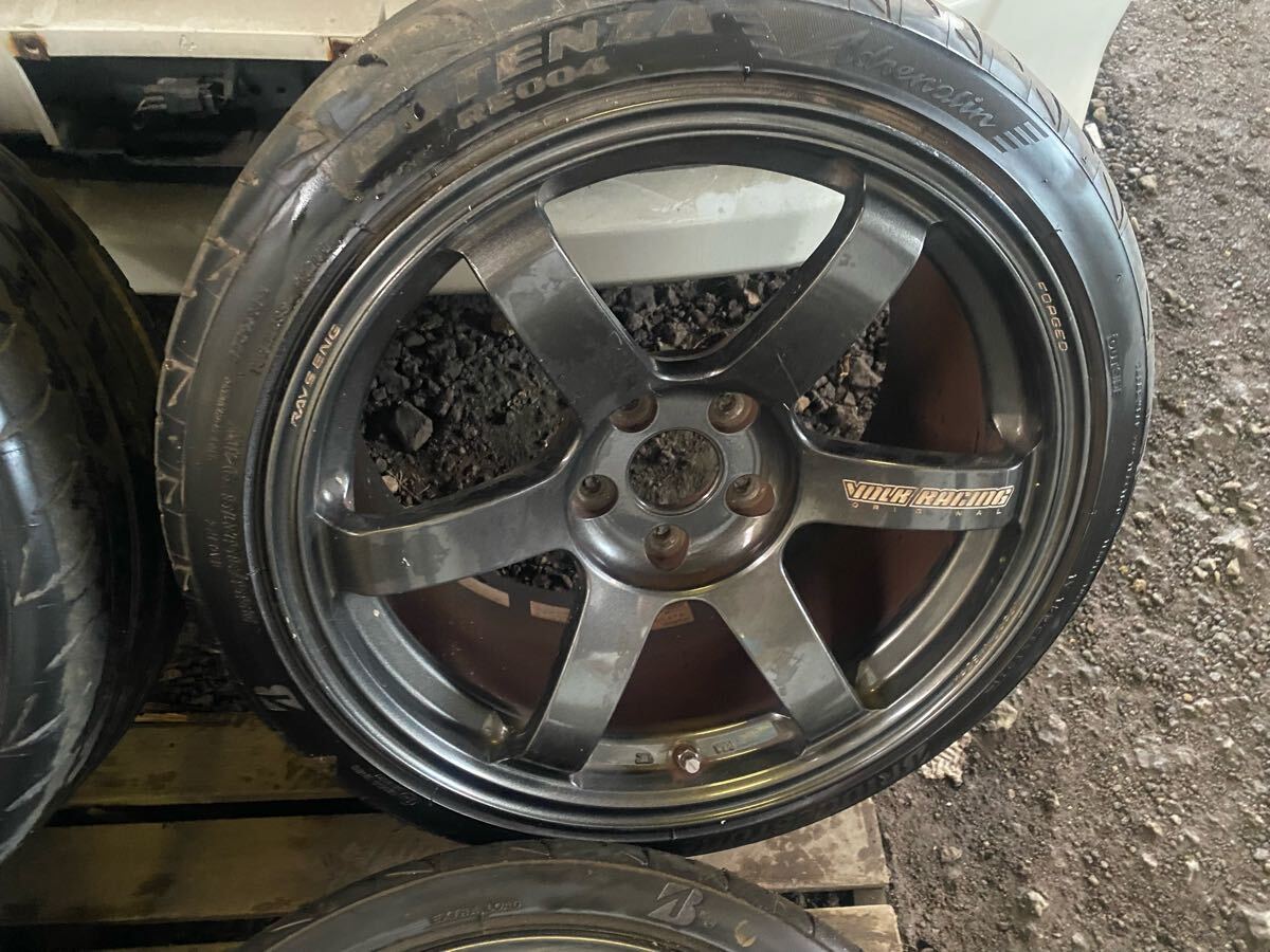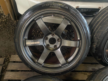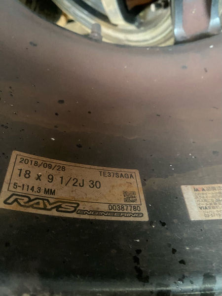 Manufacturer: RAYS TE37 SAGA; Front: 18×8.5J +50, Rear: 18×9.5J +30, 5×114.3 bolt pattern. In excellent used condition with minimal marks—see photos.