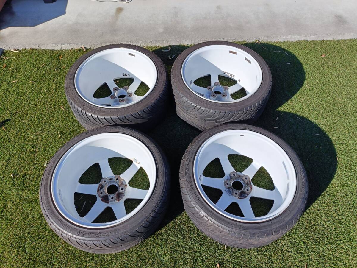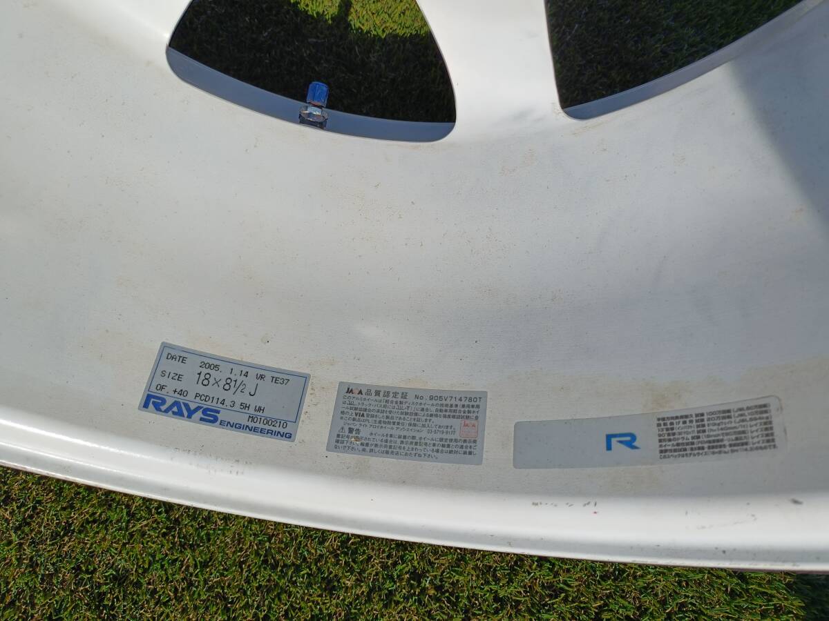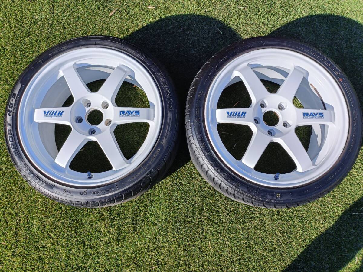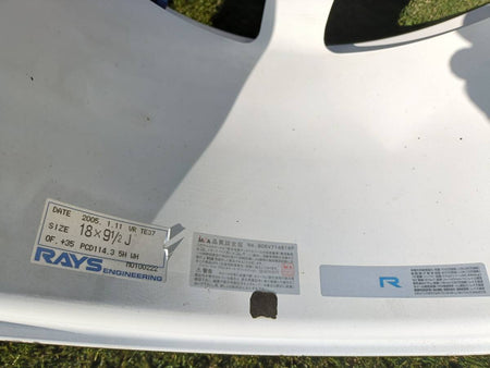 These Rays Volk Racing TE37 wheels (2005 white model) were front 18×8.5J +40 and rear 18×9.5J +35. Originally mounted on a JZA80 Supra and garaged thereafter.