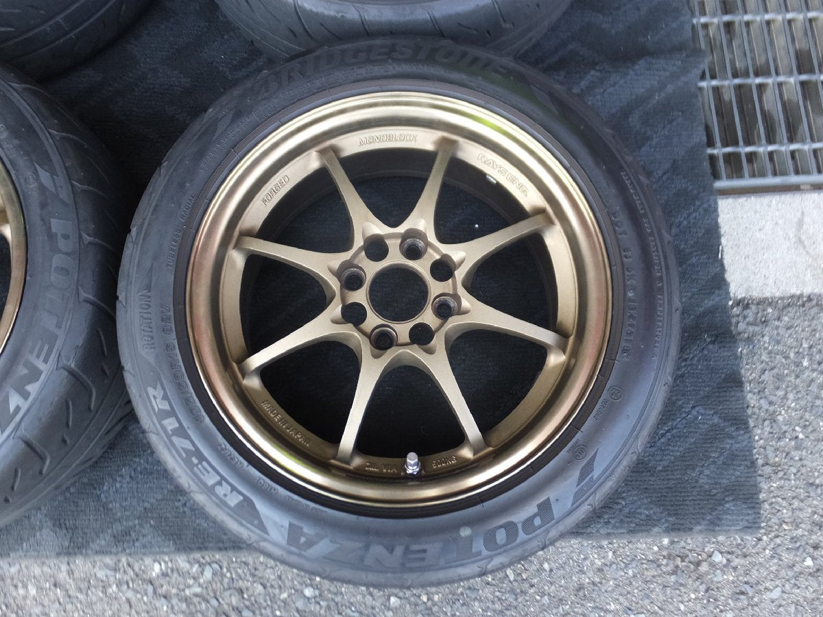 Set of 4 RAYS VOLK RACING CE28N wheels — Size: 15-inch 6.5J +35, PCD 4x100, finished in bronze. Lightweight forged wheels known for their strength and performance, ideal for compact sports cars.