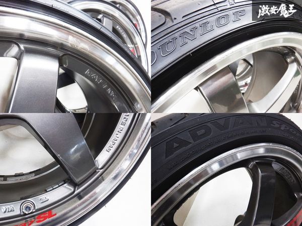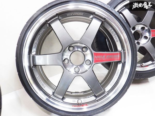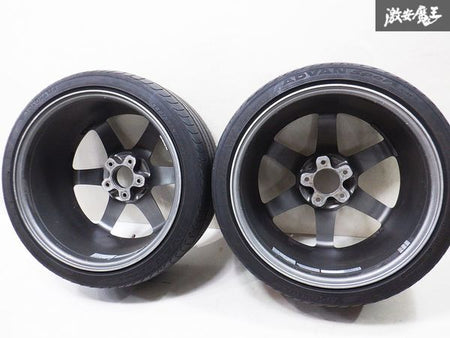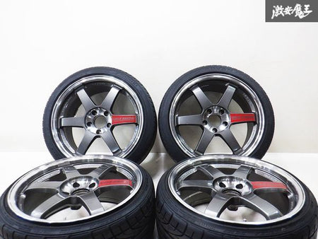 Aftermarket RAYS Volk Racing TE37SL wheels, front 18×9 +45, rear 18×9.5 +40, 5x114.3, gunmetal & polished finish.