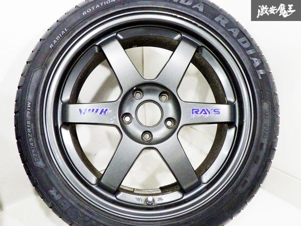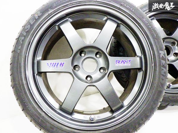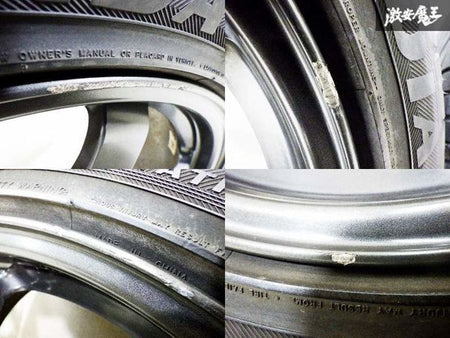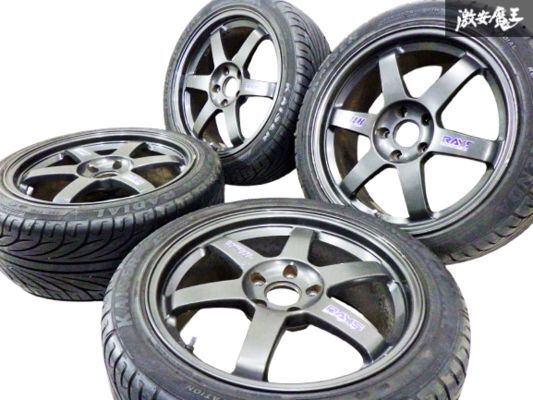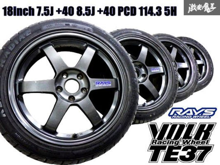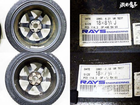 Manufacturer: RAYS VR TE37 in gunmetal; Front: 18×7.5J +40, Rear: 18×8.5J +40, 5×114.3 bolt pattern, 73 mm hub bore. See images for detailed condition.